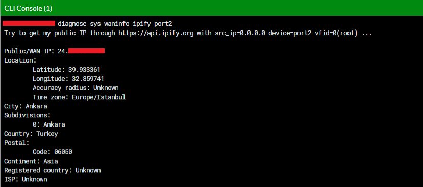 Fortigate güvenlik duvarı üzerinde birden fazla internet bağlantınız (wan) var ise, dış IP adreslerini öğrenmek için aşağıdaki komutu kullanabilirsiniz.